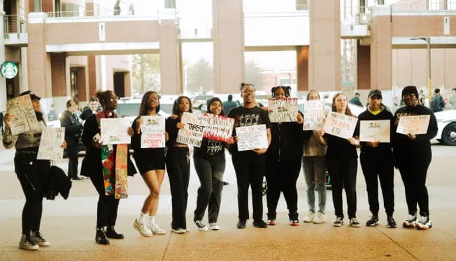Memphis Wesley, led by Pastor Tondala Hayward, gathered with other University of Memphis students gathered on campus to protest the appearance of Kyle Rittenhouse